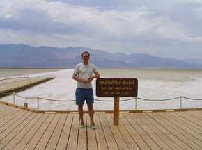Aber wenn man da einen Umweg herum macht, würde es wohl nicht auffallen. Weiter ging es in einer 20 minütigen Fahrt nach Badwater, mit 85,5 Metern uNN., die tiefste Stelle des amerikanischen Kontinents. Im Vergleich zu meinem letzten Besuch im März 2002, ist dort ein größerer Parkplatz angelegt worden und der Zugang rollstuhlgerecht ausgebaut worden. Hier lief ich knapp 10 Minuten auf der Salzkruste herum (Trinkwasserverbrauch 0,75 Liter). Außer mir war dort nur eine weitere französische Gruppe und ein amerikanisches Rentnerehepaar. Wieder zurück in Richtung Visitors Center hielten ich am Golden Canyon und ich spazierte in diesen ca. 20 Minuten herum (Trinkwasserverbrauch 1 Liter). Im Anschluss fuhr ich in 20 Minuten zum Zabriskie Point, wo ich vom Parkplatz zum Aussichtspunkt lief (Trinkwasserverbrauch 0,75 Liter). Jener wäre das Ziel gewesen, wenn ich komplett durch den Golden Canyon gelaufen wäre. Hier befinden sich nur noch schroffe, durch Sand abgeschmirgelte Berge, ohne jegliche Vegetation. Weiter ging es in 45 Minuten zum Dantes View (1.669 Meter üNN), welcher einen grandiosen Blick auf die Tiefebene des Death Valley und der Sierra mit dem Mt. Whitney bietet. Für Wohnmobile sind, speziell die letzten, engen Serpentinen nicht zu bewältigen. In 30 Minuten wieder zurück zur Hauptstrasse, fuhr ich in weiteren 45 Minuten Fahrzeit über die CA 190 bis Death Valley Junction, von wo die CA 127, welche jenseits der Staatengrenze in Nevada zur NV 379 wird, abgeht bis nach Lathrop Wells. |