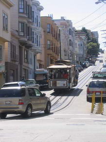 Aber da es auch dort windig und kalt war, machten wir bald kehrt und fuhren über die Golden Gate zurück zur Market Street. Auf dem Weg fuhren wir die gesamte Lombard Street entlang (wieder über den steilen Hügel), bis wir endlich den aus Funk und TV bekanntesten Teil erreichten, wo sich die Lombard über enge Serpentinen an Blumenbeeten vorbei, mit 26% Gefälle herunter schlängelt. Weiter zur Market Street fanden wir einen Parkplatz in einer Seitenstraße, welche aufgrund der herumlungernden Gestalten wenig vertrauenswürdig erschien. Aber an der Mercedes C-Klasse, welche vor uns parkte, fehlte nichtmals der Stern und so packten wir alles in den Kofferraum und ließen den Wagen dort stehen. Die Market Street ist sowohl die südliche Grenze der Innenstadt, als auch die Hauptschlagader der Stadt. Für Eisenbahnfans interessant sind die historischen Straßenbahnen der Linie F, in welchem man sich vorkommt, in einem Museum für Nahverkehr zu sein. An einer Haltestelle saß eine Frau am Boden, welche wohl etwas viel.... was auch immer eingeschmissen hat. Sie lachte so laut, dass es über die gesamte Straße schallte, nur dass niemand neben ihr Stand, wer ihr einen Witz hätte erzählt haben können. Wir spazierten die Marktet Street entlang und trafen auf der Kreuzung zur Powel Street auf die Wendeplattform der Cable Cars. Dort werden jene mit Muskelkraft um 180 Grad gedreht um in entgegengesetzter Richtung zurück zu fahren. |