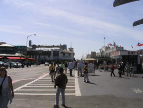 Die Straßen sind voller chinesischer Schriftzeichen und es reiht sich ein Gemüseladen an das andere Fischgeschäft, bzw. der nächsten Videothek mit chinesischen Filmen. Viele der Bewohner sprechen gar kein Englisch und auf der Straße ist Kantonesisch die vorherrschende Sprache. Erst richtig interessant wird Chinatown, wenn man die Hauptstraßen verlässt und zu Fuss in die kleinen Gassen einbiegt, was wir auch machten. Da wir kaum noch Benzin im Tank hatten, mussten wir dort nach einer Tankstelle fragen, was mangels chinesischer Sprachkenntnisse meinerseits, gar nicht so einfach war. Wir verbrachten eine knappe Stunde im chinesischen Viertel, bevor wir weiter zum Fisherman´s Wharf fuhren, wo die Parksituation am schlimmsten ist und wir 3x um den Block fuhren, bevor wir etwas fanden. Der Fishermans ´s Wharf ist der ehemalige Fischereihafen, welcher zu einer Touristenattraktion umgebaut worden ist. Vom nahen Pier 41kann man Bootstouren zu der Gefängnisinsel Alcatraz oder durch die Bay (dabei die Golden Gate durchquerend) buchen. Der berühmte Pier 39, bzw. der dazugehörige Steg, bietet allerlei Souvenirläden und sonstige Geschäfte, die die Welt nicht braucht. Dort war auch der Erschrecker von San Franzisko im Einsatz, welcher hinter einem Blätterzweig versteckt, Leute erschrickt und dafür ein Trinkgeld erwartet. Bescheuerte Ideen, aber scheint lukrativ zu sein, denn im letzten Jahr war er auch schon dort. |