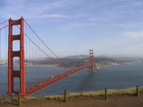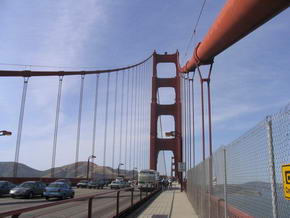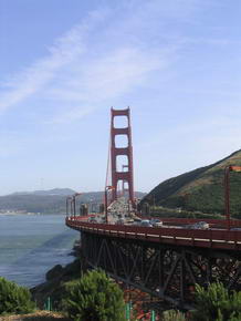 Die Hauptstahlstränge sind knapp einen Meter dick und bestehen aus 27.000 bleistiftdicken Einzeldrähten. Wir spazierten bis zur Mitte der Brücke und konnten dabei die Wellenreiter beobachteten, die auf „die“ Welle warteten. Aber alles in allem ist es aufgrund der Autos sehr laut dort, sodass wir unser Vorhaben nicht umsetzten, sie komplett zu überqueren. Da wir auch eines der 100.000 Autos sein wollten, welche die Brücke täglich befahren, machten wir uns auf den Weg, sie von Süden nach Norden zu überqueren. Auf dem Weg ist noch keine Maut zu entrichten, erst auf dem Rückweg sind nach dem Überfahren $3 (Stand 2004) fällig. Auf der Nordseite der Bay angekommen, wollte ich zu einem Aussichtspunkt, den ich schon im Vorjahr schlecht gefunden hatte. Als wir plötzlich in Sausolito, dem ehemaligen Hippieviertel landeten, war das aber auch nicht schlimm. Dieser Vorort schien mir einer der teuersten zu sein. Auf der Küstenstraße befinden sich teure und nobel wirkende Restaurants und Cafes mit einem Yachthafen. Wir entschlossen uns, den Berg hinauf zu fahren (nicht minder Steil, als die Straßen in San Franzisko) und kamen durch eine Gegend, kleiner, aber sehr teuer wirkender Häuser mit noblem Karossen vor der Garage. Von dort aus hatte man einen genialen Blick auf die Bucht. Wieder zurück zur Brücke, fand ich denn auch schließlich den genialen Aussichtspunkt. |
