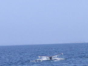 Da das Schiff immer in einem Abstand von 500 Metern zu dem Wal blieb, konnte man außer der Fontaine und der Rückenflosse nicht wirklich viel sehen. Im Abstand von ca. 15 Minuten tauchte der Blauwal ab, sodass man die riesige Schwanzflosse sehen konnte. Dies hatte allerdings zur Folge, dass er auch die nächsten 10 – 15 Minuten tauchte. Da wir meist im Wind am Bug des Schiffes standen, wo es am kältesten war, war ich trotz dickem Pullovers, worüber ich noch ein Hemd gezogen hatte, ziemlich durchgefroren. Daher war ich auch froh, als das Schiff nach zwei Stunden Fahrt der Küste in nördlicher Richtung entlang, kehrt machte und wieder zum Hafen zurück fuhr. In Summe dauerte die Fahrt 2 ½ Stunden, wofür wir je $25 zu zahlen hatten. Ehrlich gesagt, fand ich die Tour nicht so prickelnd. Sicherlich ist es klasse, diese Riesen der Meere in Natura gesehen zu haben, aber im Grunde sieht man auch nicht so viel. |