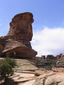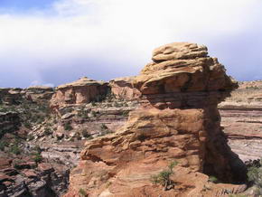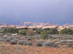 Die Entfernungen zwischen den einzelnen Parkteilen sind mit dem Fahrzeug erheblich, obwohl Luftlinie gar nicht so weit. Wir bewegten uns in dem District „The Needles“, welcher aus lauter Felstürmen besteht. Unser erster Weg führte uns zum Big Spring Canyon Overlook. Hierzu fuhren wir vom Visitors Center etwa 15 Minuten über eine asphaltierte Straße und hatten am Ziel Ausblicke über Schluchten, Felsen und Steinsäulen. Dort Abzweigend befinden sind einige Trails, welche wir aber nicht begingen. Wieder zurück, fuhren wir vorbei am Pothole Point, auf direktem Weg zu Elephant Hill, einem Felsen, welcher mit viel Phantasie wie ein Elefant aussehen soll.. Die letzten 3 Meilen = 4,8 km Meter sind jedoch Dirtroad, aber trotzdem mit dem PKW gut zu bewältigen, soweit es nicht geregnet hat. Am sich dort befindlichen kleinen Parkplatz und Picknick Punkt zweigen weitere Wege ab, welche aber aufgrund der Steigung nur mit einem 4WD zu bewältigen sind. Wir stiegen kurz aus, machten ein paar Fotos, entschlossen uns aber für einen schnellen Rückzug, da ersichtlich war, dass eine dunkelschwarze Regenfront auf uns zu kommen würde. Obwohl die Gegend sehr viel versprechend war, verzichteten wir auf einen Trail und fuhren wieder zurück. Wir legten noch einen kurzen Stop am Squaw Flat, wo wir einen kleinen Campingplatz durchfuhren ein, ohne allerdings den Wagen zu verlassen. |