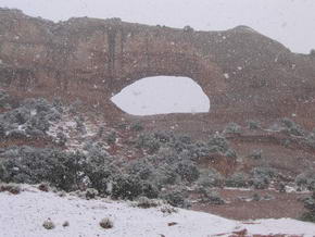 Aufgrund des starken Regens, kamen wir nicht schnell voran, wobei es weiteren Verlauf der US-191 zu schneien begann. Glücklicherweise blieb der Schnee nur auf der Wiese und nicht auf der Fahrbahn liegen. Nach 40 Meilen = 64 km von Moab aus erreichten wir den Abzweig zur UT-211, welcher zum Canyonlands Nationalpark führt. Diesen Highway folgten wir durch eine recht abwechslungsreiche Landschaft 33 weitere Meilen = 53 km, bis wir den Eingang mit dem Visitors Center erreichten. Glücklicherweise besserte sich mittlerweile auch das Wetter, so dass die Wolkenlücken immer größer wurden. Da der Park recht abgeschieden liegt, war dieser von allen bei unserer Reise besuchten, am wenigsten Besucht. Der Canyonlands Nationalpark ist in sich sehr zerklüftet und daher nur über drei, nicht miteinander verbundene Zugänge, nämlich The Maze, Island in the Sky / Canyonlands und The Needles zu erreichen. |