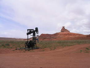 Mittlerweile bereits 12.30 Uhr, fuhren wir die US-191 weiter südlich, bis Bluff, wo wir östlich auf die US-163 wechselten und in 86 Meilen = 138 km, bzw. einer Stunde und 40 Minuten zum Mexican Hut gelangten. Die Steckenführung war landschaftlich nicht aufregend und die Gegend bis auf die Orte Blanding und Moticello (wo wir einen Tankstop einlegten und an einer Telefonzelle zu Hause anriefen) auch recht menschenleer. Um 14.30 Uhr erreichten wir den Mexican Hat, wo die Temperatur mit ca. 23 Grad Celsius wieder recht angenehm war. Jener ist schon von weitem zu sehen und ist ein flacher Stein von ca. 20 Metern Durchmesser, welcher auf einer Felsnadel balanciert. Um näher heran zu kommen, verließen wir die US-163 rechts abbiegend und fuhren etwa 2 Meilen auf einer Off-Road-Piste zu jenem Fels, an einer weiteren Gabelung wieder rechts abbiegend, wo die Strasse schließlich endete und sich eine alte Pumpe zur Erdölförderung befindet. |