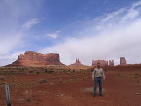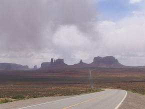 Hier wurden wir von einem Bentley (neustes Modell) überholt, wahrscheinlich das Dienstfahrzeug des Oberindianers, da wir uns kurz nach dem Mexican Hut auf Indianergebiet (Navajo Indien Reservation) befanden, ein Gebiet mit besonderen Verwaltungsrechten. Bekannt ist das Monument Valley, durch diverse Westernfilme und durch die Marlboro Werbung. Der Highway führt mitten durch das Valley, was streng genommen eine Steppenlandschaft ist und bietet am Straßenrand reichlich Möglichkeiten zum Fotografieren. Deshalb schenkten wir es uns auch, in den angrenzenden Park zu fahren, wo $2,50 Eintrittsgeld fällig wird. Dadurch, dass wir näher an die Monolithen herankommen, würde sich der Blick nicht verbessern, so unser Gedanke. Zudem ist eh ein Allradfahrzeug notwendig, um den Valley Drive zu fahren und eine geführte Tour für weitere $25 in einem Jeep, wollten wir erst recht nicht. Zudem war zu erkennen, dass zwei Meilen weiter ein Sandsturm tobte. |