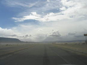 Es wirkte, als ob sich dort eine rote Wand befinden würde. Da wir weiter Richtung Süden wollten, mussten wir jene nun durchqueren. Mitten in diesem Sandsturm begann es zudem auch noch ein wenig zu regnen, sodass unser weißes Auto ab dem Zeitpunkt nicht mehr weiß war. An einer Straßenkreuzung bogen wir rechts ab, um zu den von dort aus schon ersichtlichen Hütten zu fahren, in welchen der Navajo-Stamm seine Handwerkskunst anbot. Allerdings waren dieses alles Dinge, welche nicht von unserem Interesse waren (Ketten, Steine u.ä.). Zudem befanden wir immer noch in dem zuvor beschriebenen Sturm, sodass wir binnen einer Minute wieder im Auto waren, da es schon zwischen den Zähnen knirschte. Millerweile schon nach 16 Uhr, machten wir uns auf den Weg, die restliche Wegsstrecke nach Page zu bewältigen. Hierzu folgten wir weiter US-163, bogen in Kayenta auf die US-160, um später auf die AZ-98 bis zu unserem Tagesziel zu fahren. |