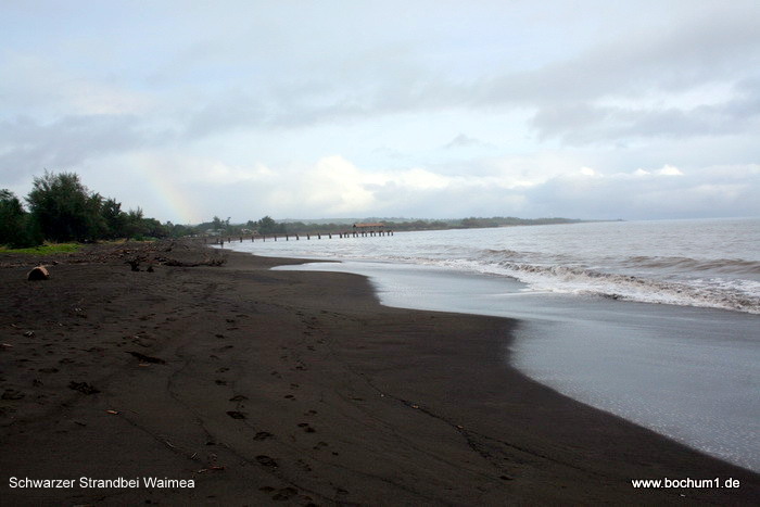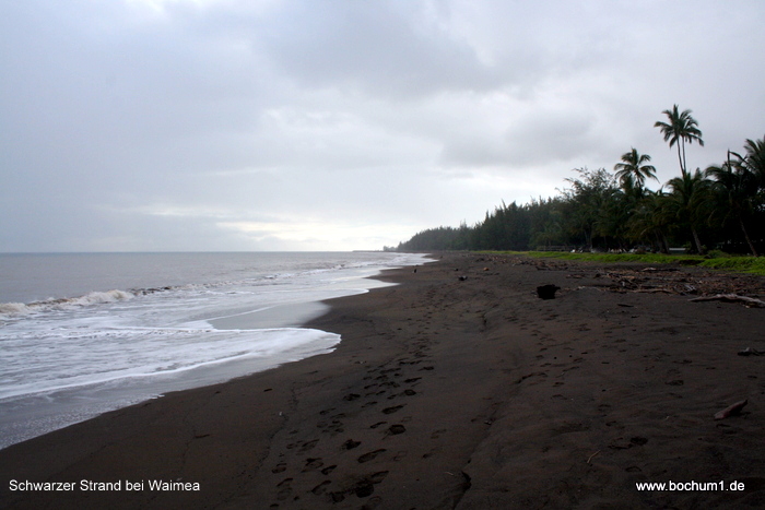 es regnete. Also ganz zurück zur Südküste, in den Sonnenschein von Waimea. Dort besuchten wir kurz den Strand mit „pech“ schwarzem