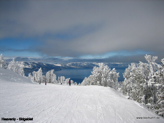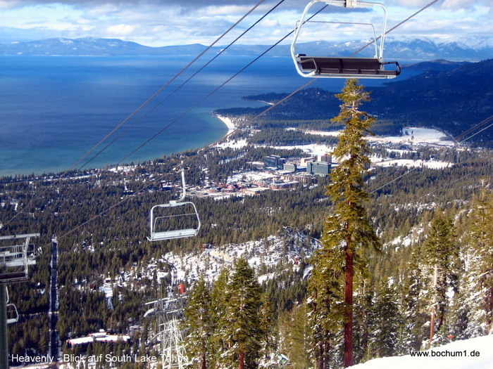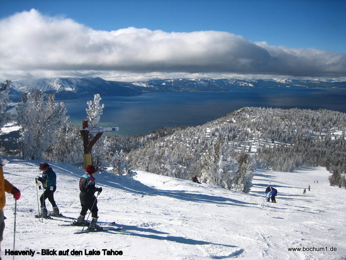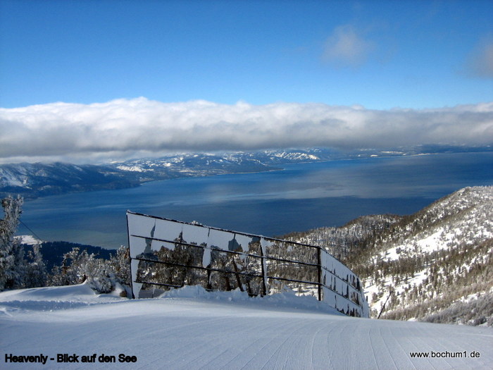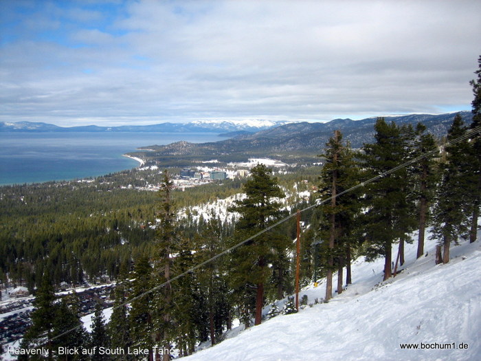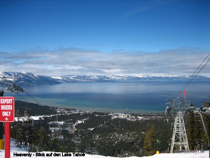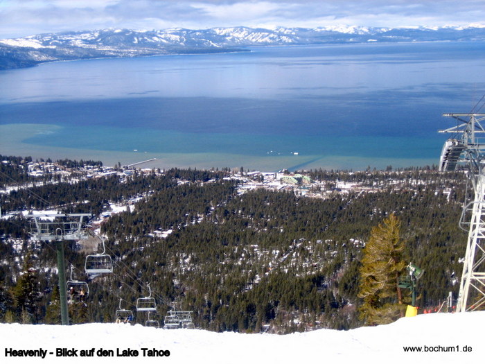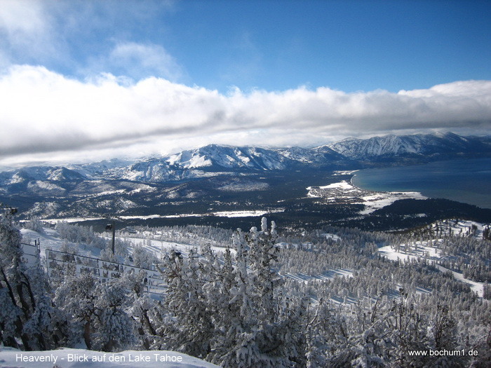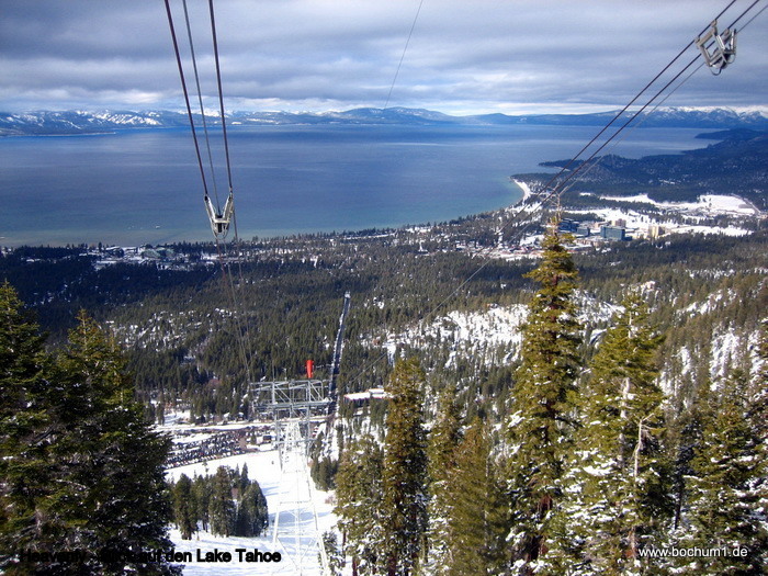 Dabei immer frontaler Blick auf den Lake Tahoe, dessen verschneites Ufer