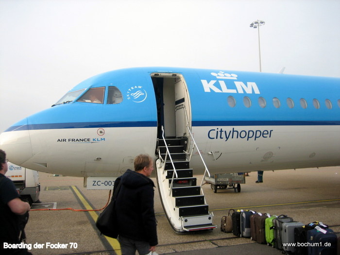 Abflug und der Bus fuhr uns zur Außenposition, wo diverse Focker 70 der KLM