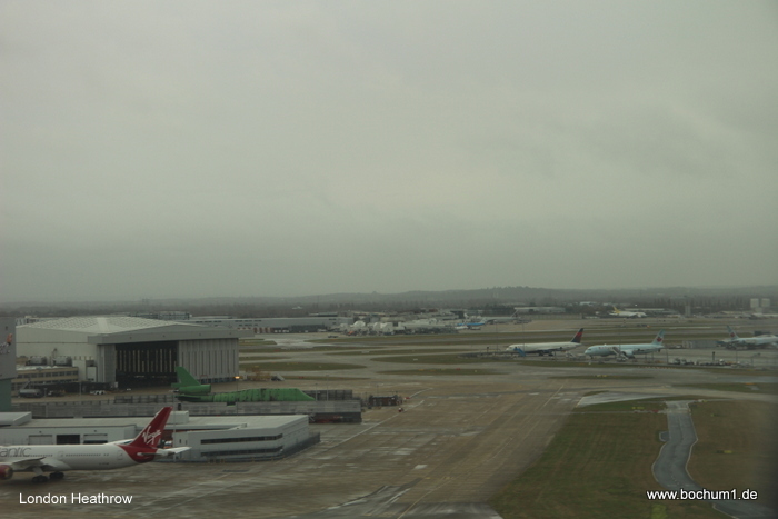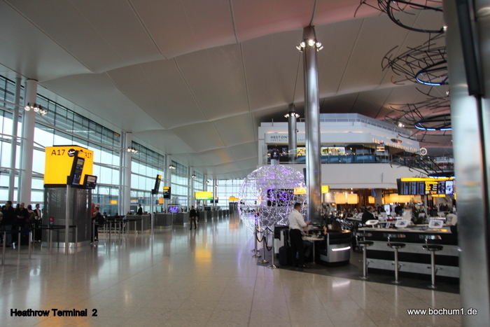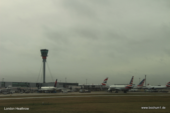Heathrow. Der Flieger war 90% gebucht und zu essen gab es ein Butterbrot,