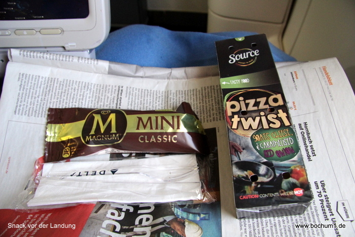 Std. vor der Landung gab es noch einen Pizza-Wrap und ein Eis – an der Menge