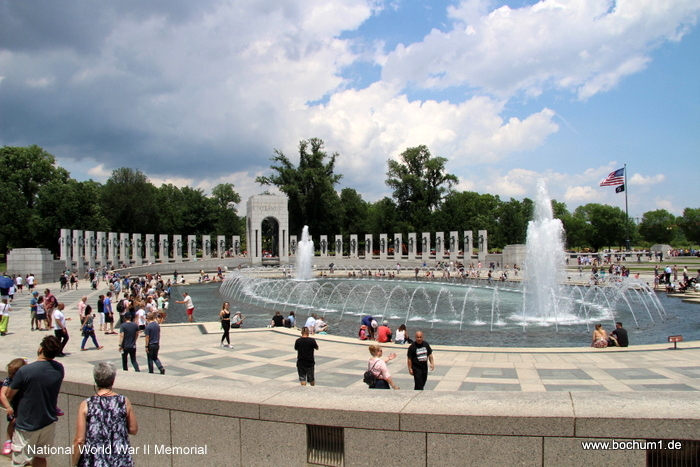 World War II Memorial. Letzteres ist umrahmt von 56 in 2 Reihen, im
