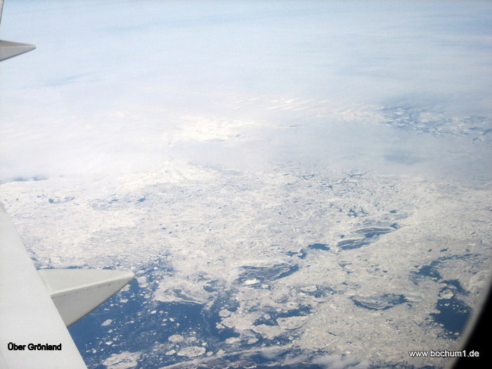 Grönland überfliegend. Über das verschneite Kanada wieder südlich und über