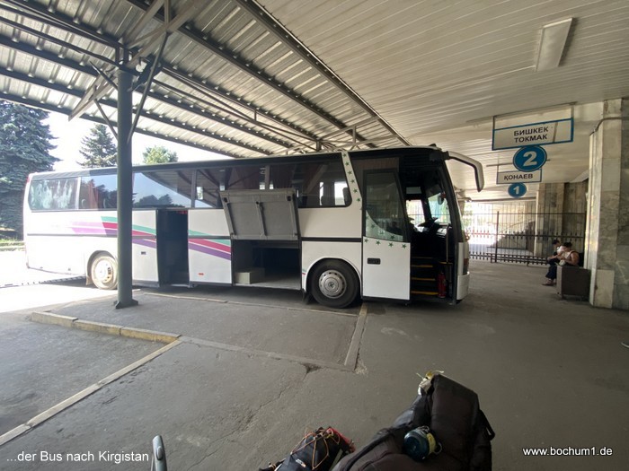 schon 20 Jahre alte Bus, mit kirgisischen Kennzeichen, mit zahlreichen